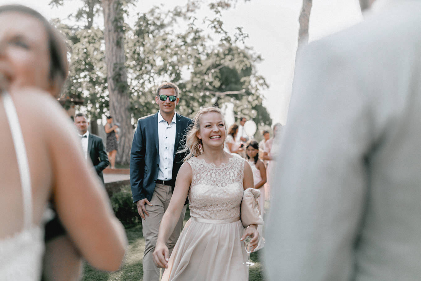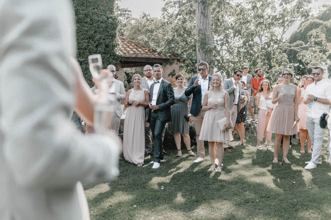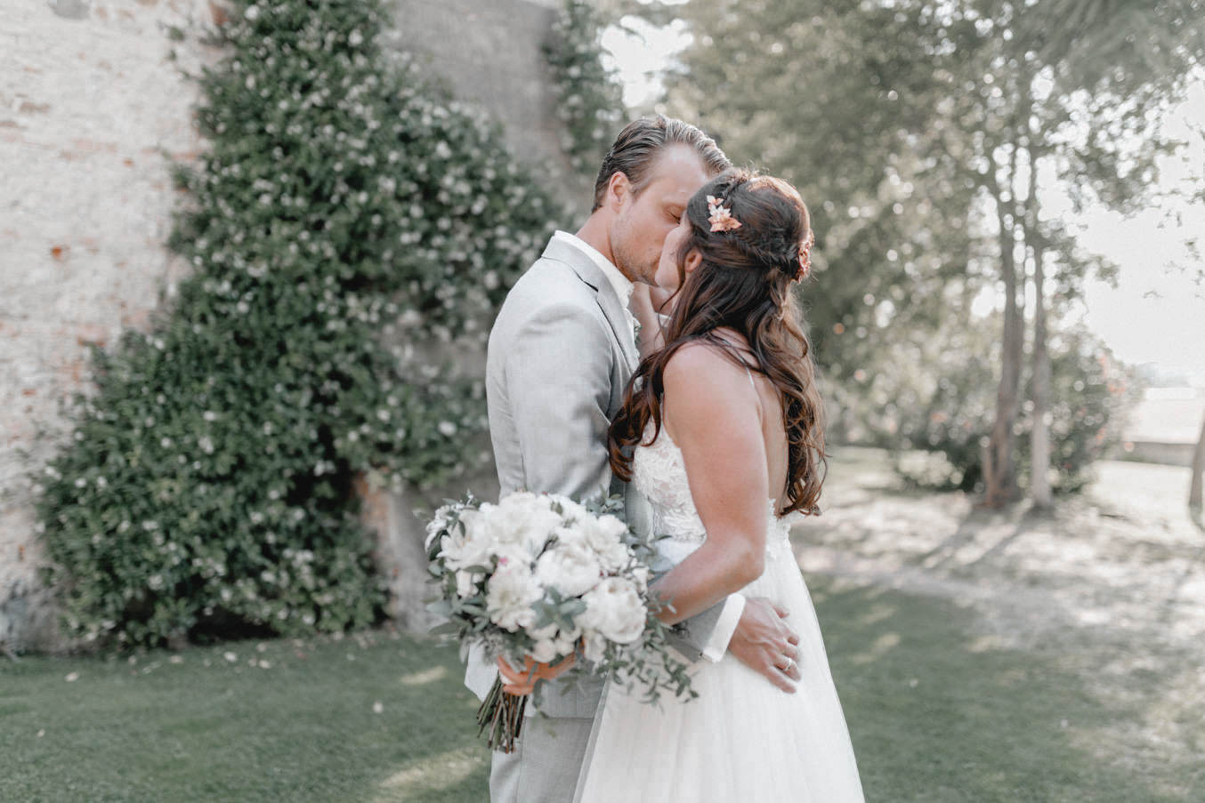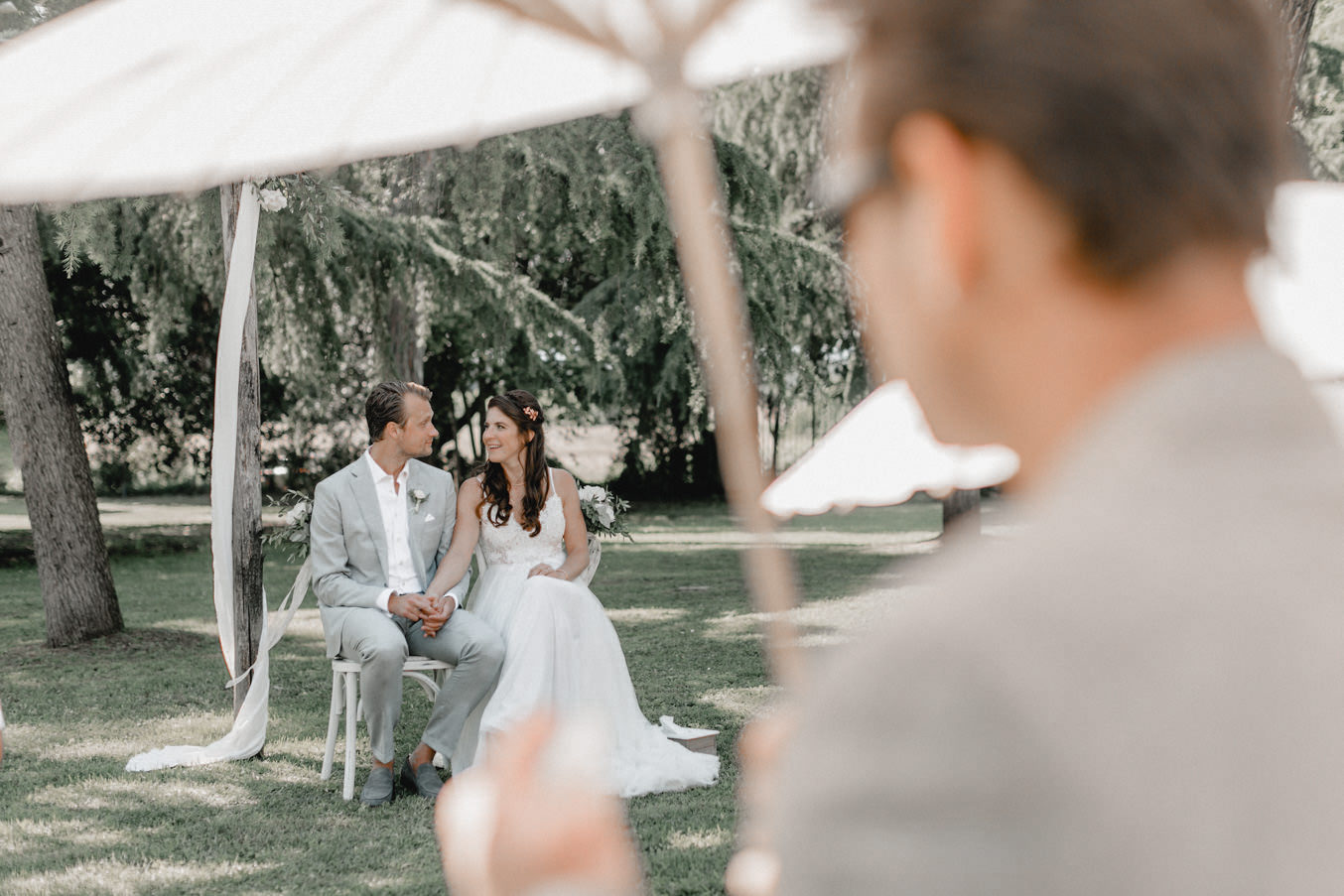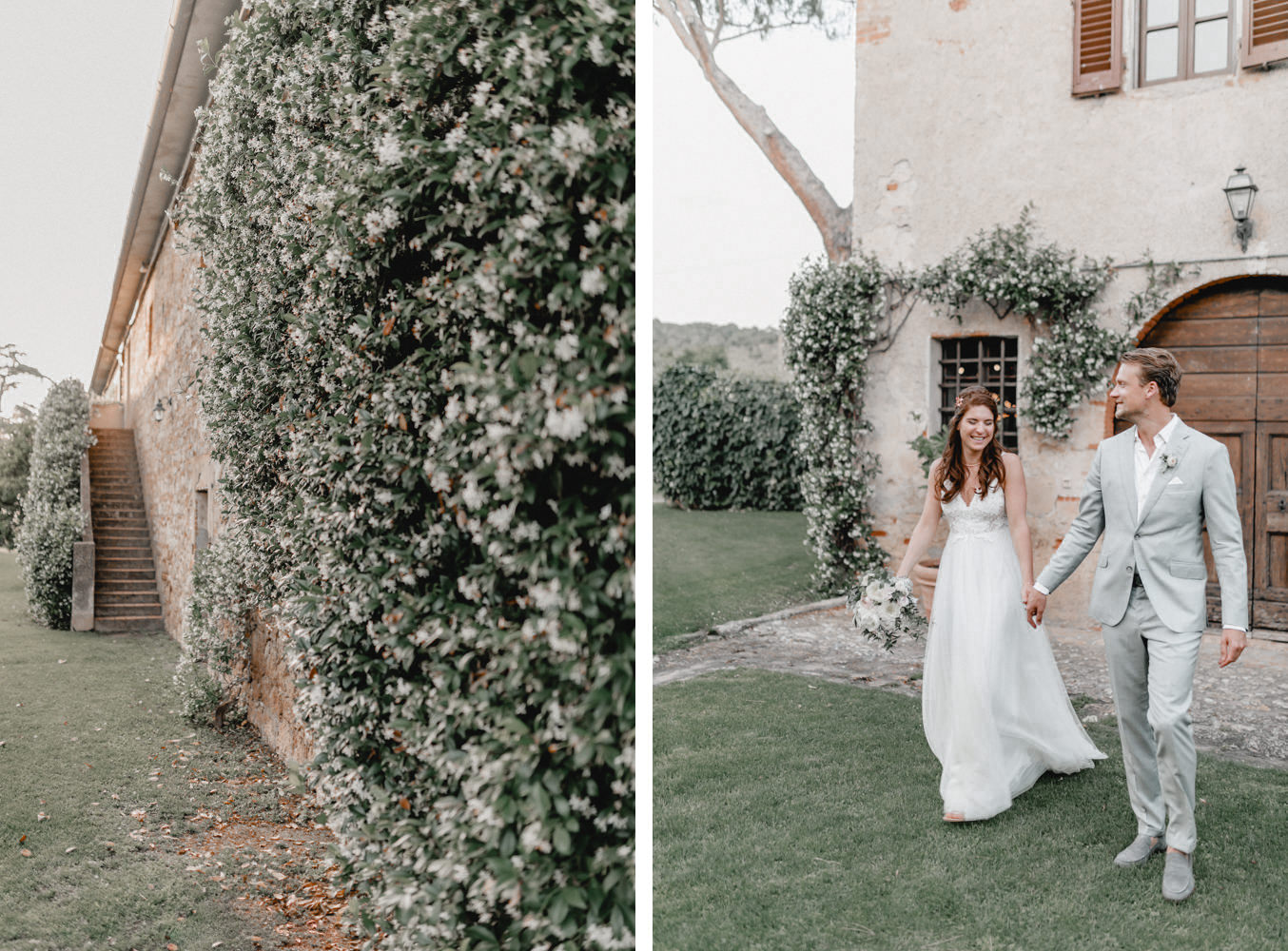 Am Hochzeitstag konnte ich kaum erwarten als Hochzeitsfotograf durchzustarten und noch mehr Liebe und Momente in der Toskana einzufangen. Die Location, das La Pescaia Resort, ist ein traumhafte Hochzeitslocation in der Toskana. Am Pool des Pescaia Resorts gab es vor der Trauung einen Empfang mit erfrischenden Getränken für die Gäste. Katrin von Sagt Ja, die liebe Hochzeitsplanerin der Beiden, verteilte sogar Papierschirme um etwas Schatten zu spenden. Somit konnten die Gäste die Zeremonie in der Mittagssonne entspannt genießen. Nach der emotionalen Trauung und den unglaublich schönen Eheversprechen, die sie sich sagten, ging es für den Empfang zurück zum Poolbereich. Dort konnten wir zwischen den wilden Jasminblüten (es roch so gut!) auch erste Brautpaarbilder fotografieren.