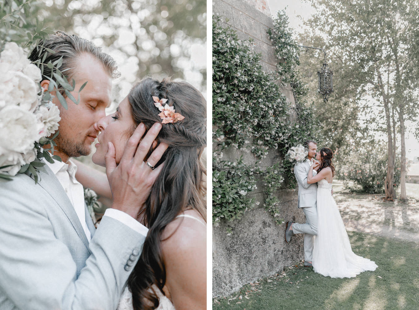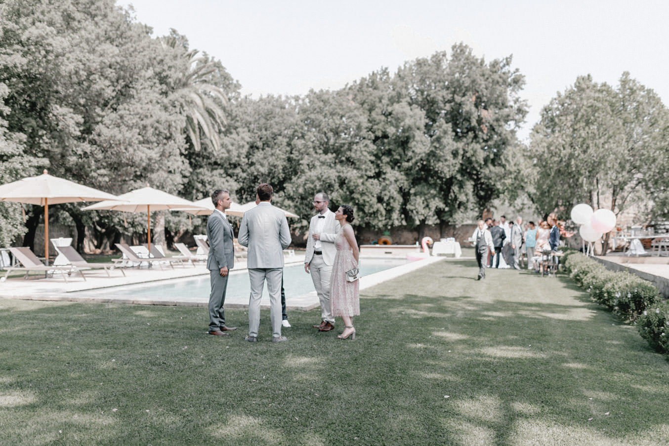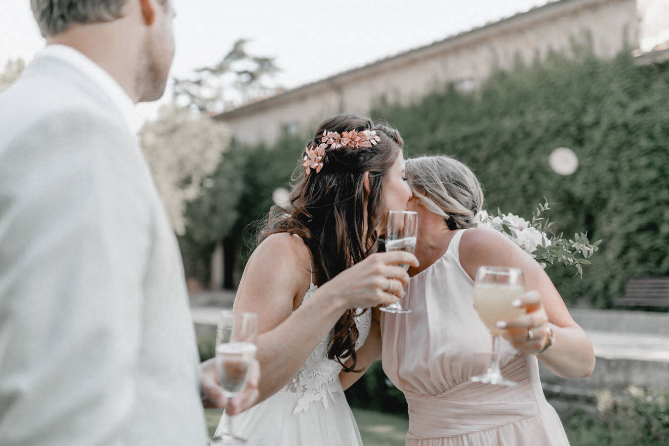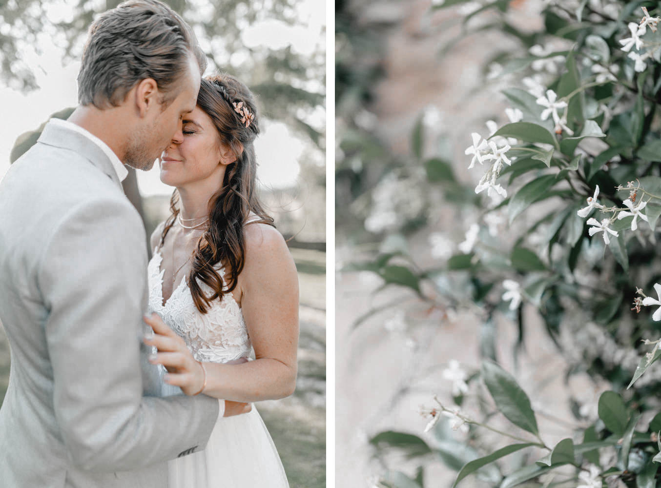 Am Hochzeitstag konnte ich kaum erwarten als Hochzeitsfotograf durchzustarten und noch mehr Liebe und Momente in der Toskana einzufangen. Die Location, das La Pescaia Resort, ist ein traumhafte Hochzeitslocation in der Toskana. Am Pool des Pescaia Resorts gab es vor der Trauung einen Empfang mit erfrischenden Getränken für die Gäste. Katrin von Sagt Ja, die liebe Hochzeitsplanerin der Beiden, verteilte sogar Papierschirme um etwas Schatten zu spenden. Somit konnten die Gäste die Zeremonie in der Mittagssonne entspannt genießen. Nach der emotionalen Trauung und den unglaublich schönen Eheversprechen, die sie sich sagten, ging es für den Empfang zurück zum Poolbereich. Dort konnten wir zwischen den wilden Jasminblüten (es roch so gut!) auch erste Brautpaarbilder fotografieren.