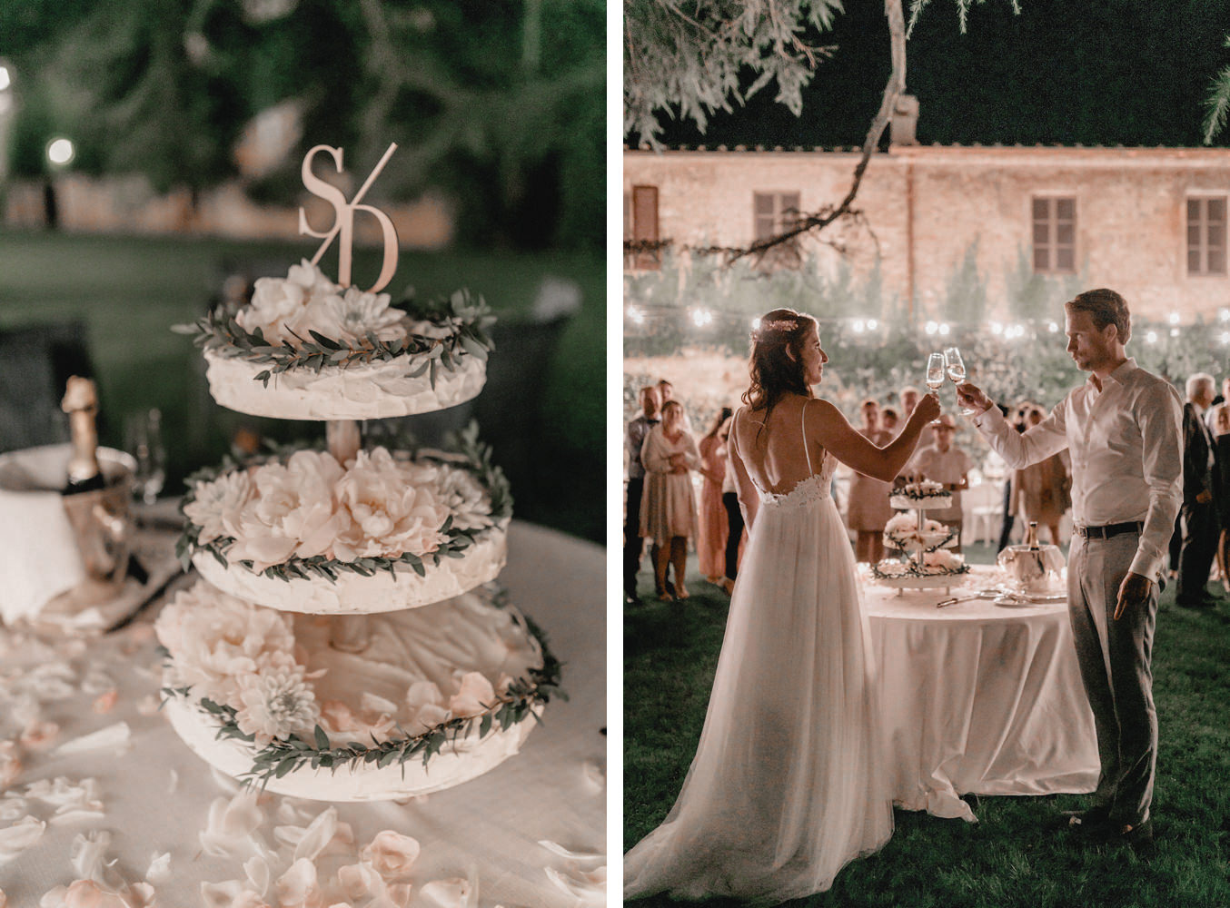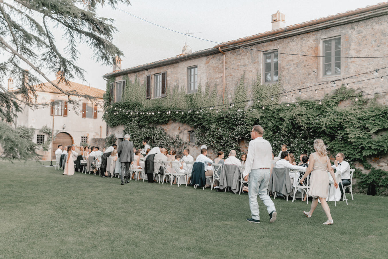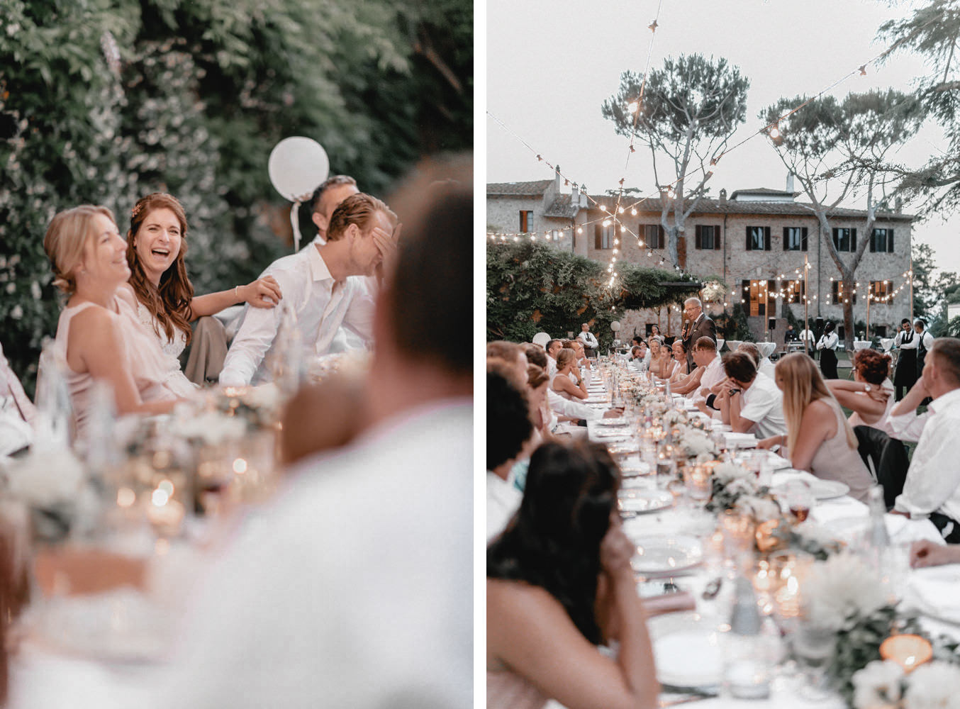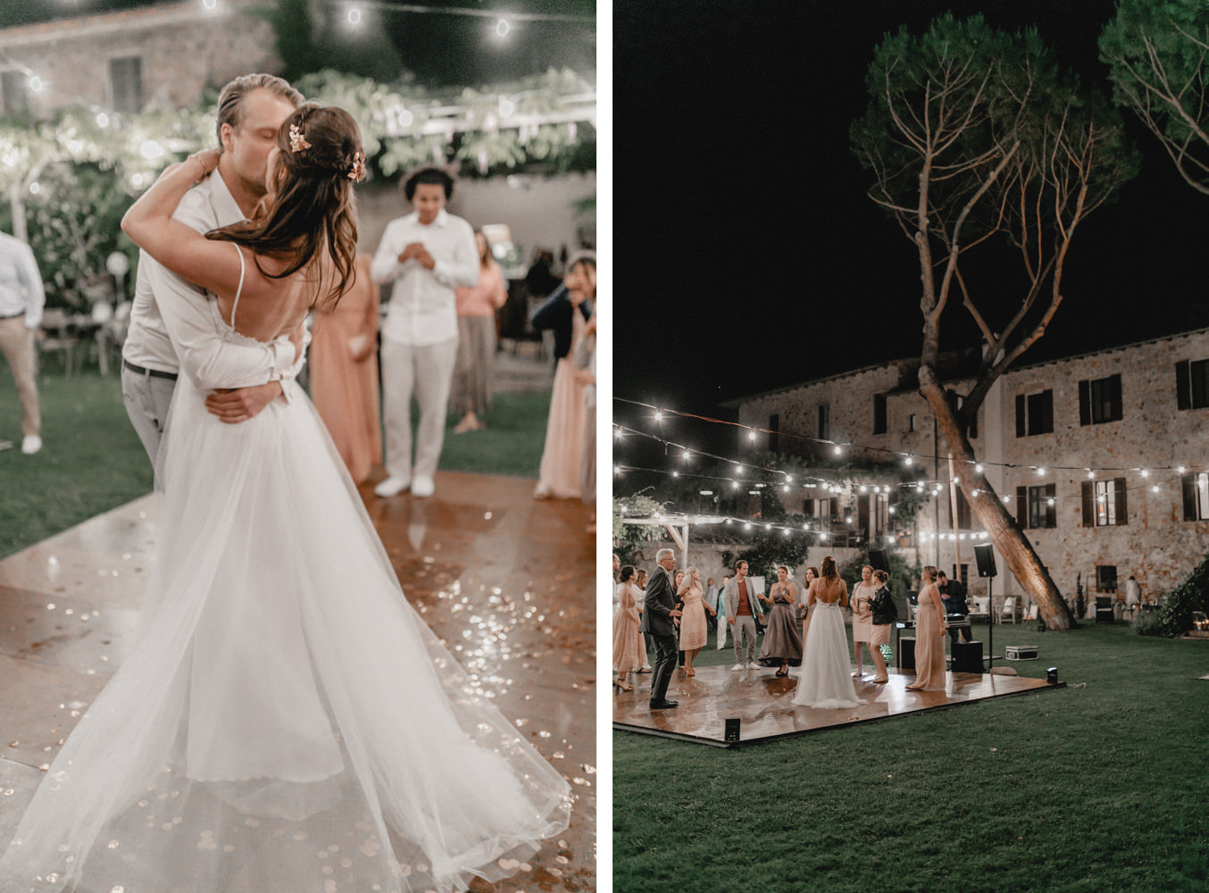 Das Dinner fand im Innenhof des Pescaia Resorts statt, der mit vielen Blumen und Lichterketten dekoriert war. Ich liebe diese Art von Abendessen im Sommer, vorallem mit den funkelnden Lichterketten. Während des Abendessens nahm ich die Beiden auch nochmal zu einem kleinen Shooting mit Blick über die Toskana mit. Der Sonnenuntergang und das Licht waren perfekt. Nach dem Essen konnten sie auch noch lange unter freiem Himmel feiern und tanzen. Ein zauberhafter Abschluss für drei wundervolle Tage voller Liebe in der Toskana.