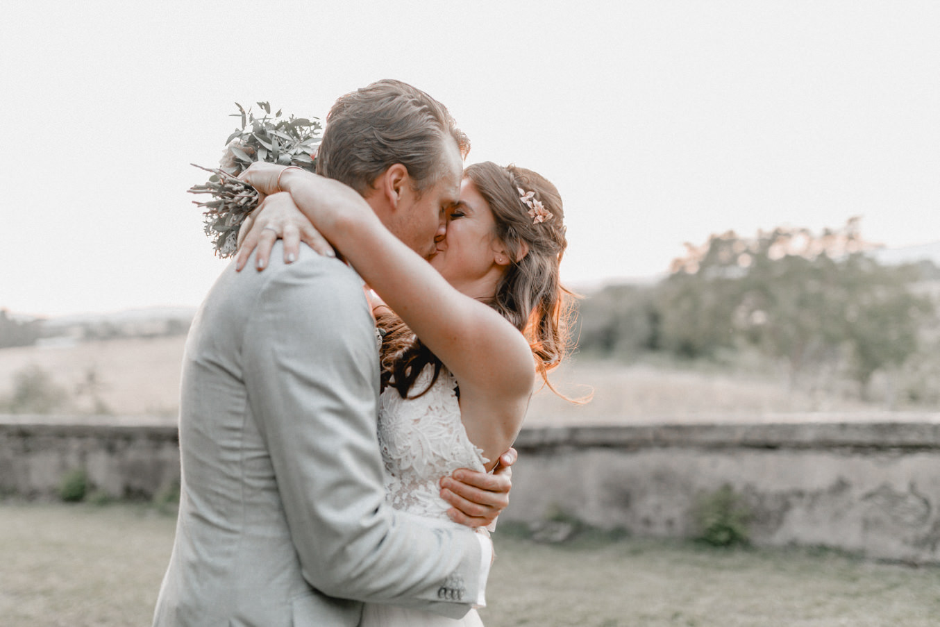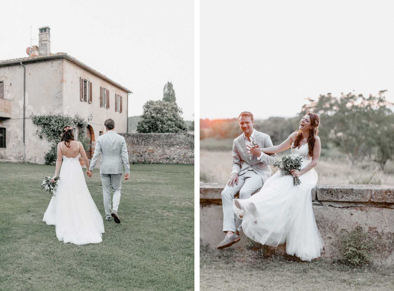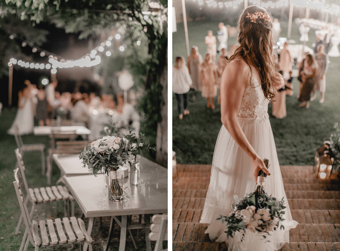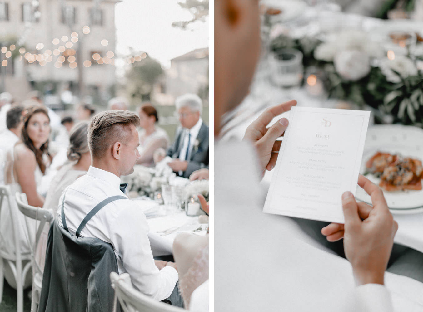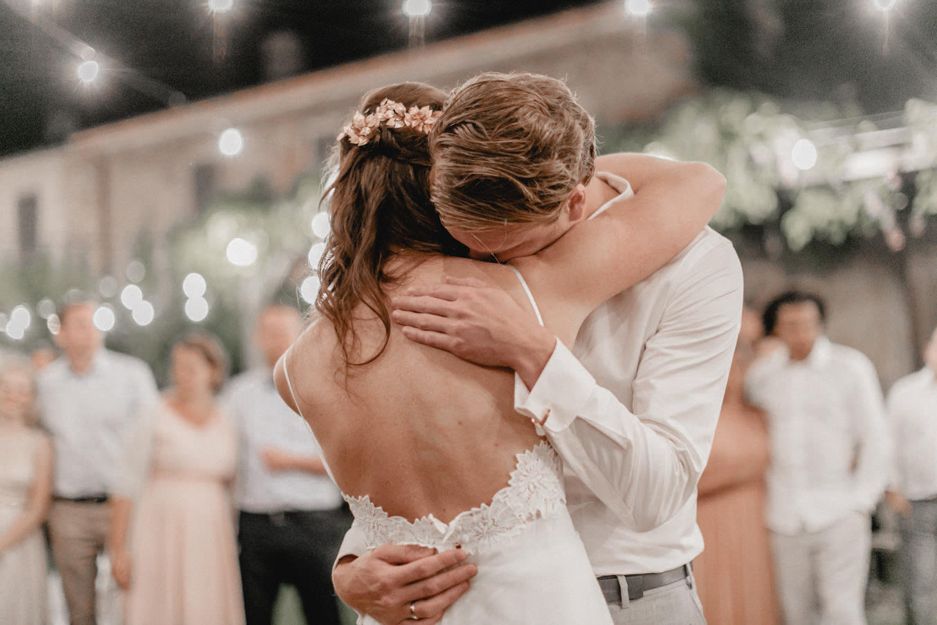 Das Dinner fand im Innenhof des Pescaia Resorts statt, der mit vielen Blumen und Lichterketten dekoriert war. Ich liebe diese Art von Abendessen im Sommer, vorallem mit den funkelnden Lichterketten. Während des Abendessens nahm ich die Beiden auch nochmal zu einem kleinen Shooting mit Blick über die Toskana mit. Der Sonnenuntergang und das Licht waren perfekt. Nach dem Essen konnten sie auch noch lange unter freiem Himmel feiern und tanzen. Ein zauberhafter Abschluss für drei wundervolle Tage voller Liebe in der Toskana.