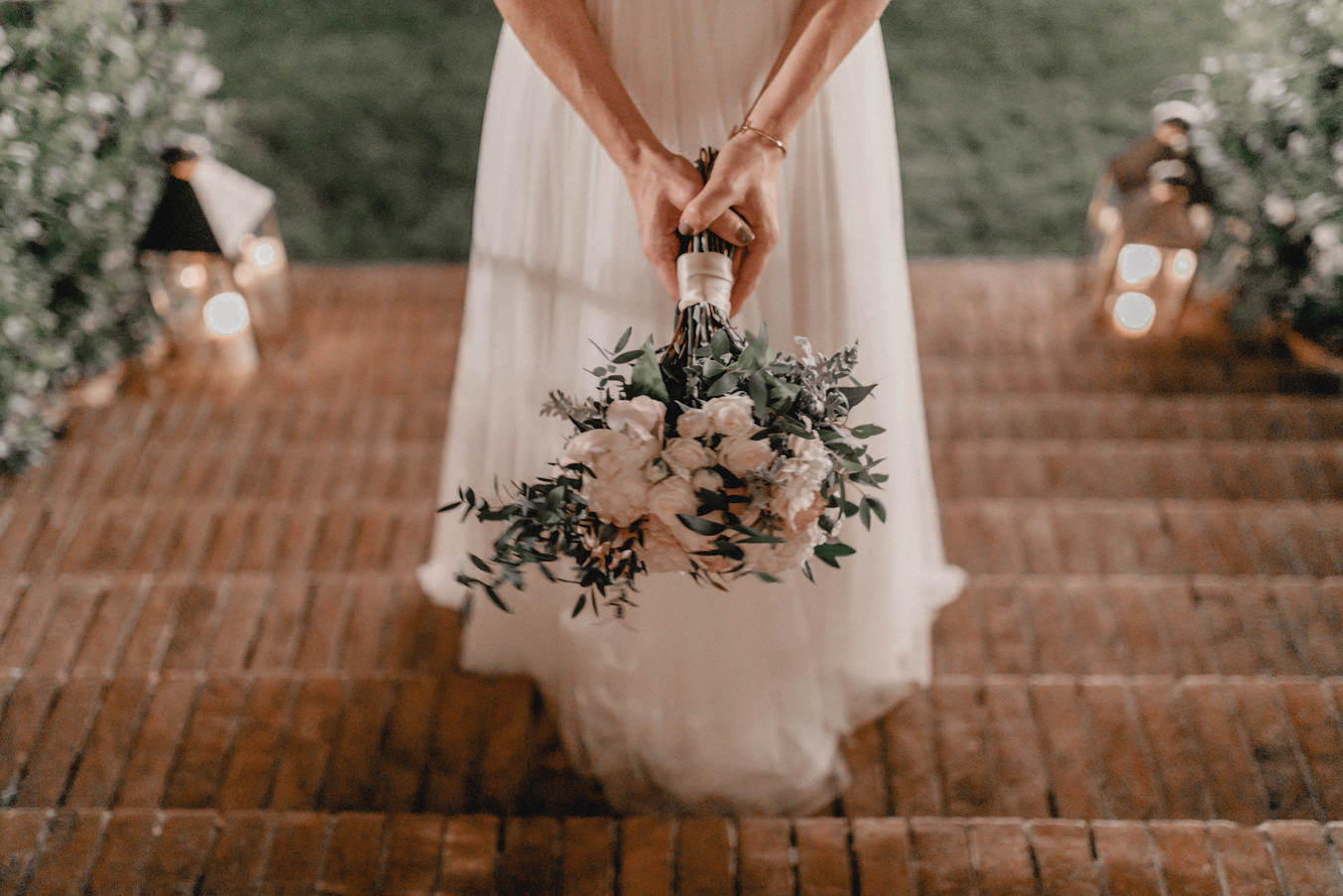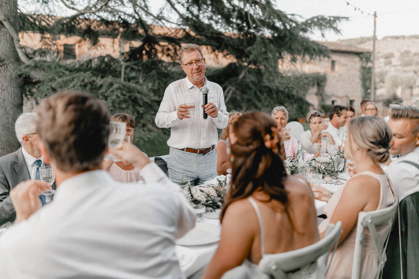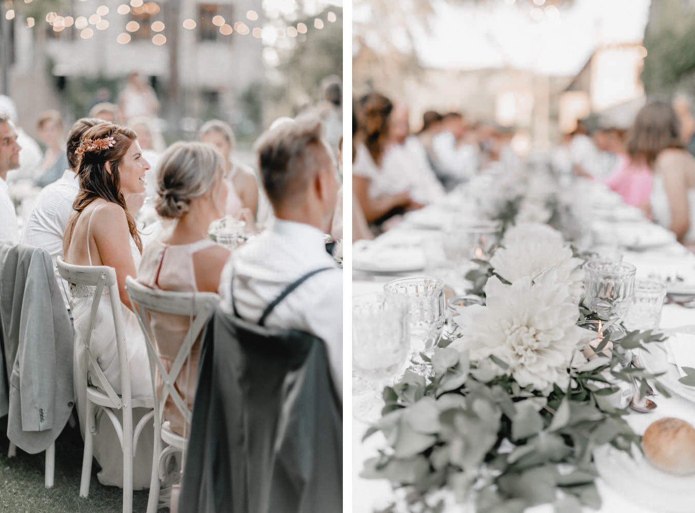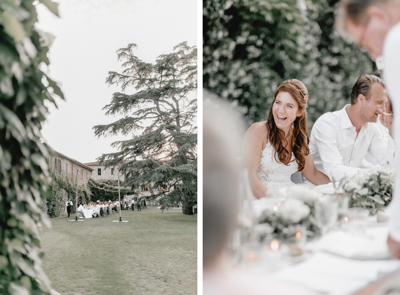 Das Dinner fand im Innenhof des Pescaia Resorts statt, der mit vielen Blumen und Lichterketten dekoriert war. Ich liebe diese Art von Abendessen im Sommer, vorallem mit den funkelnden Lichterketten. Während des Abendessens nahm ich die Beiden auch nochmal zu einem kleinen Shooting mit Blick über die Toskana mit. Der Sonnenuntergang und das Licht waren perfekt. Nach dem Essen konnten sie auch noch lange unter freiem Himmel feiern und tanzen. Ein zauberhafter Abschluss für drei wundervolle Tage voller Liebe in der Toskana.